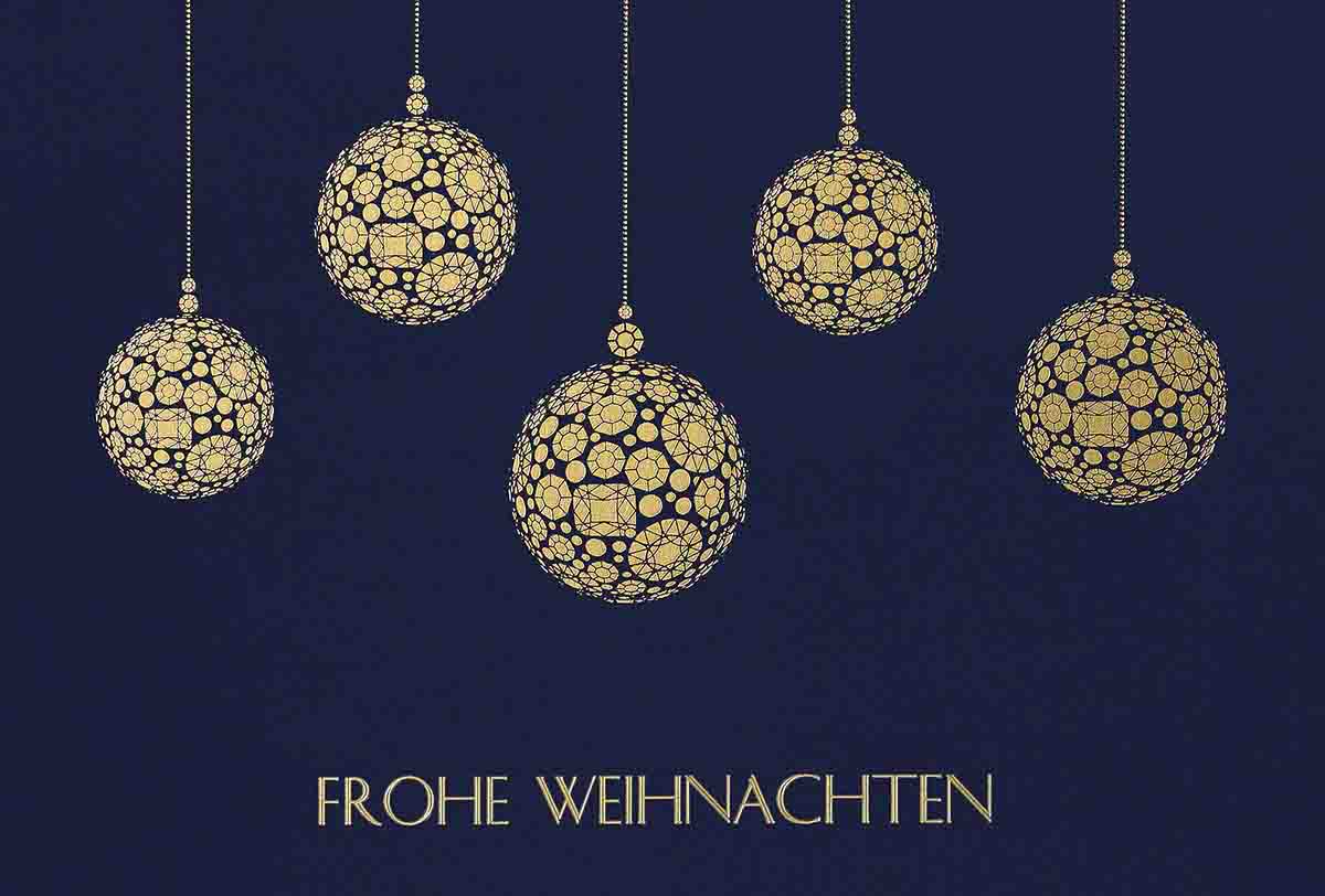Darunter steht in silberner Folienprägung der Gruß "Frohe Weihnachten - Ein gutes neues Jahr". Kleine silberne Pünktchen rieseln als Schneeflocken herab.
