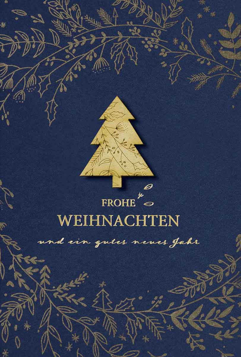 Weihnachtskarte aus mattem, blauen Karton mit cremeweißem Falteinlegeblatt innen.