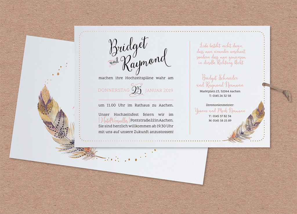 Einladungskarte im trendigen "Bohemian-Look" mit Lederbändchen, Einschubkarte und aufgedruckter Vogelfeder.