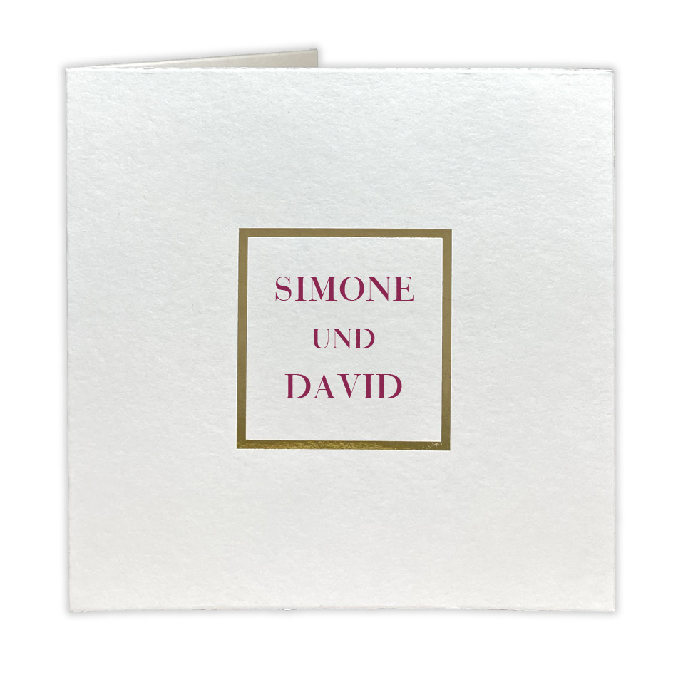 Zu dieser Büttenkarte gibt es eine passende Menükarte, Tischkarte, Save-the-Date-Karte, Dankkarten und Kirchenheft.