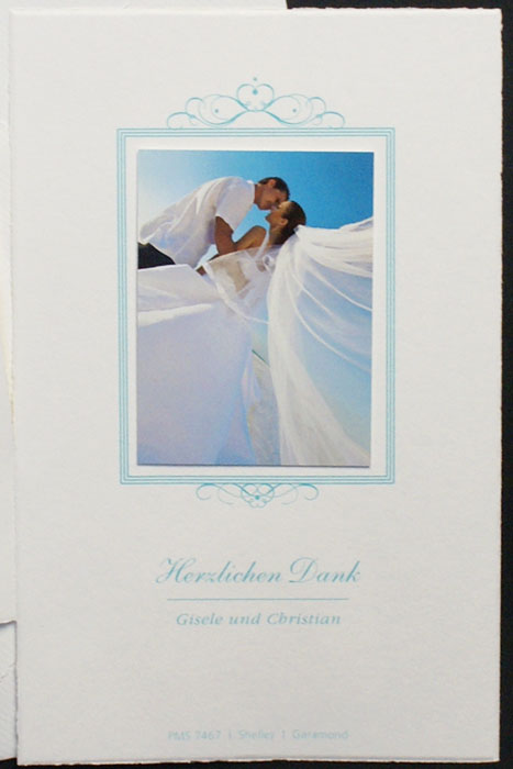 Dankkarte aus hochwertigem, weißem Design-Karton mit Büttenrand. Ein Rahmen mit Ornament aus drei dünnen, türkisfarbenen Linien bildet einen Rahmen für Ihr eigenes Foto im Format bis zu 5 x 6,5 cm (bxh).