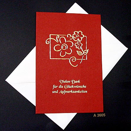 Danksagungskarte für Geburtstag, Hochzeit oder Jubiläum, aus edlem rotem Design-Karton mit Goldfolien-Relief.