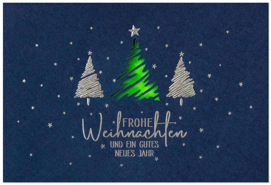 Dunkelblaue Weihnachtsgrußkarte mit lasergestanztem Baum und Silberprägung, Einleger weiß