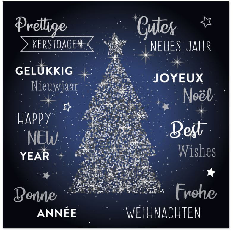 "Frohe Weihnachten und ein gutes neues Jahr" und ein Tannenbaum sind in gold geprägt.