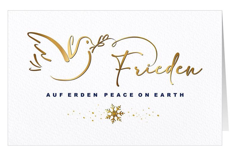 In gold und silber sind die Worte und der Gruß "Glück - Kraft - Frieden - Zuversicht - Hoffnung - Gesundheit - Friedvolle Weihnachten" auf die blaue Vorderseite geprägt.