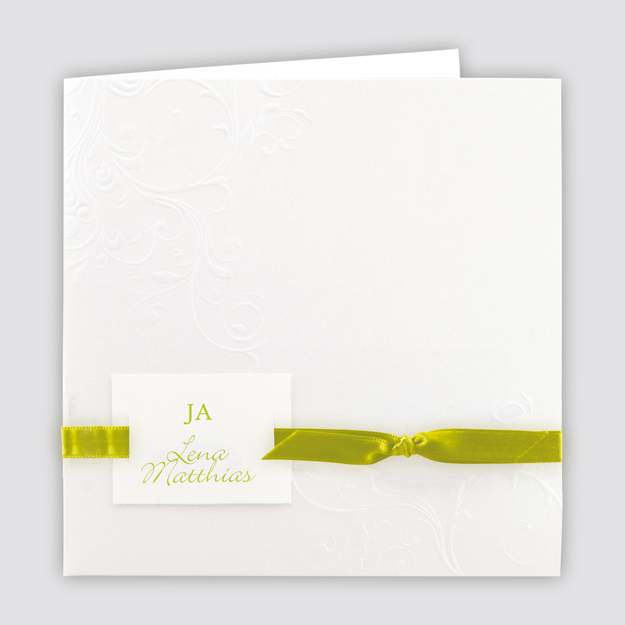Einladungskarte cremeweiß metallic mit Ornamentprägung und Bändchen in grün
