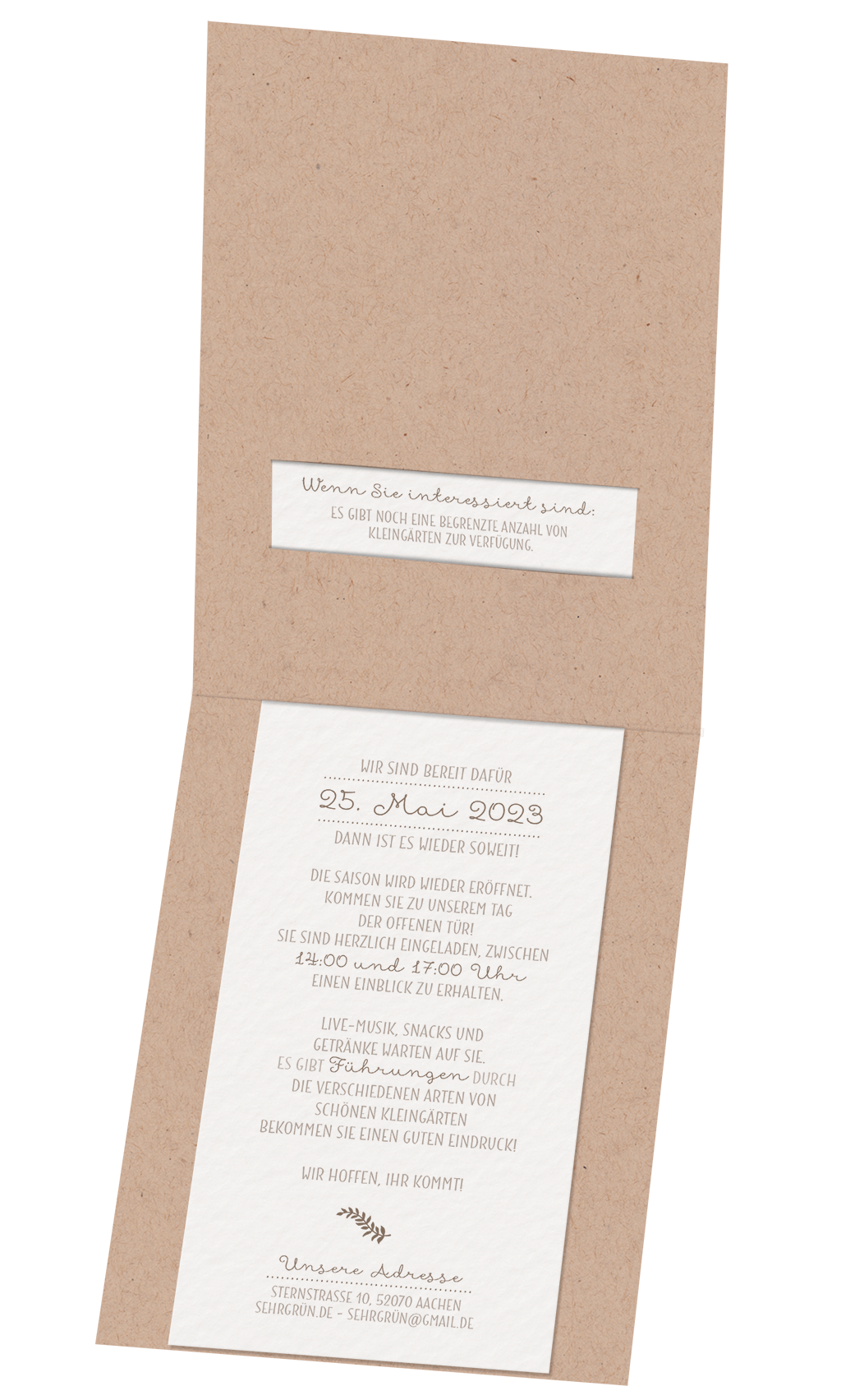 In unserem Beispiel wurde die Karte als Einladung zu einem "Tag der offenen Tür" eines Kleingartenvereins verwendet. Die Karte eignet sich auch gut als Einladungskarte zur Goldenen Hochzeit oder Geburtstagseinladungskarte.