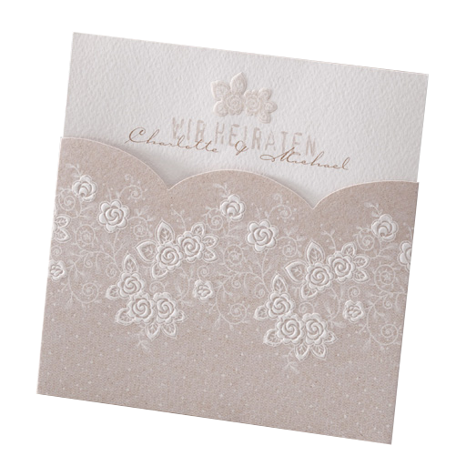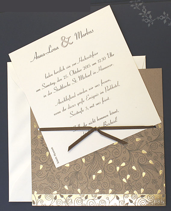 Einladungskarte, Einstecktasche aus hochwertigem, sandfarbenem Struktur-Karton mit Konturstanzung und Goldfolienprägung.