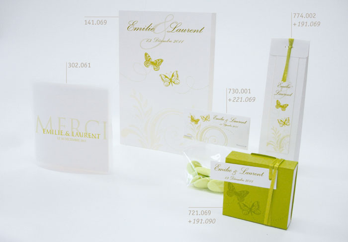 Einladungskarte aus hochwertigem, weißem Metallic-Karton mit Farbdruck und Silberfolienprägung. Diese Karte wird mit einem exklusivem, mit Schmetterlingen bedrucktem Briefumschlag geliefert.