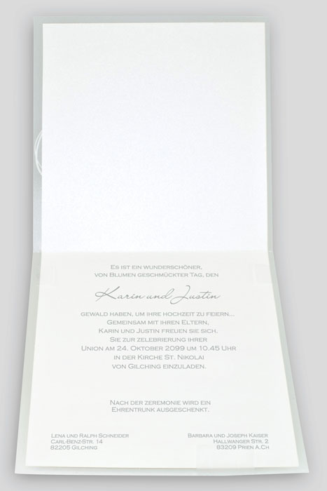 Einladungskarte aus hochwertigem, cremeweißem Metallic-Karton mit umhüllender Transparentfolie mit weißem Ornamentdruck. Mit einer kleinen Kunststofflasche kann die Karte verschlossen werden.