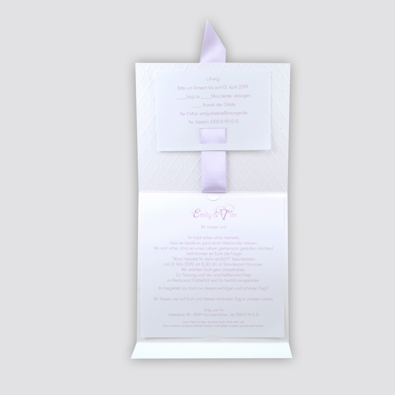 Einladungskarte weiß mit Rautenmuster, Band fliederfarben & optionalem Strasssteinchen