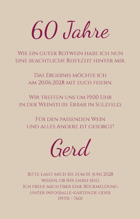Einladungskarte zum 60. Geburtstag "Zeit zum Genießen!" mit Rotweinflasche und Weingläsern