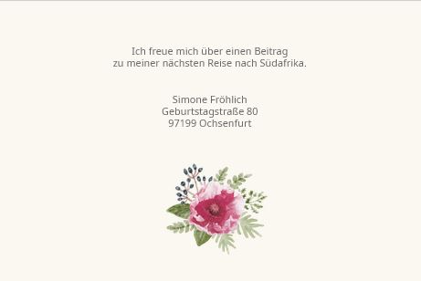Nutzen Sie die Rückseite für praktische Hinweise, wie zum Beispiel Geschenkewünsche oder Ihre Adresse. Ein kleines Blumen-Element rundet das Design harmonisch ab.