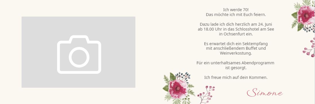 Einladungskarte zum 70. Geburtstag im floralen Aquarell-Design als Klappkarte mit eigenem Fotodruck auf der Innenseite