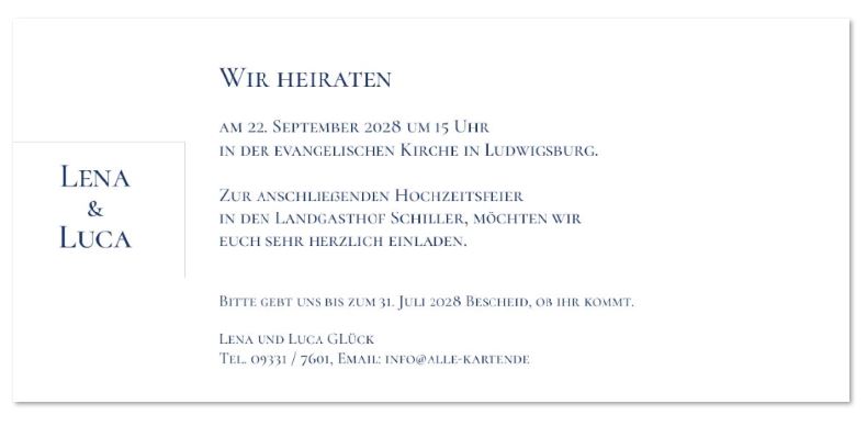 Hochzeitskarte aus hochwertigem, nachtblauem Design-Karton und 1-seitigem Einlegeblatt.