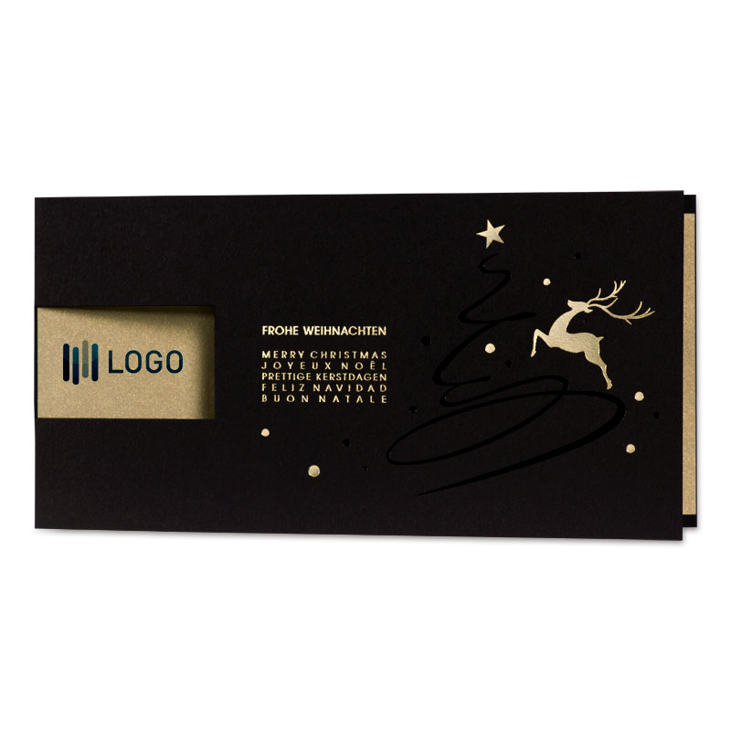 Firmen-Weihnachtskarte mit mehrsprachigem Gruß und Fensterstanzung für Logo