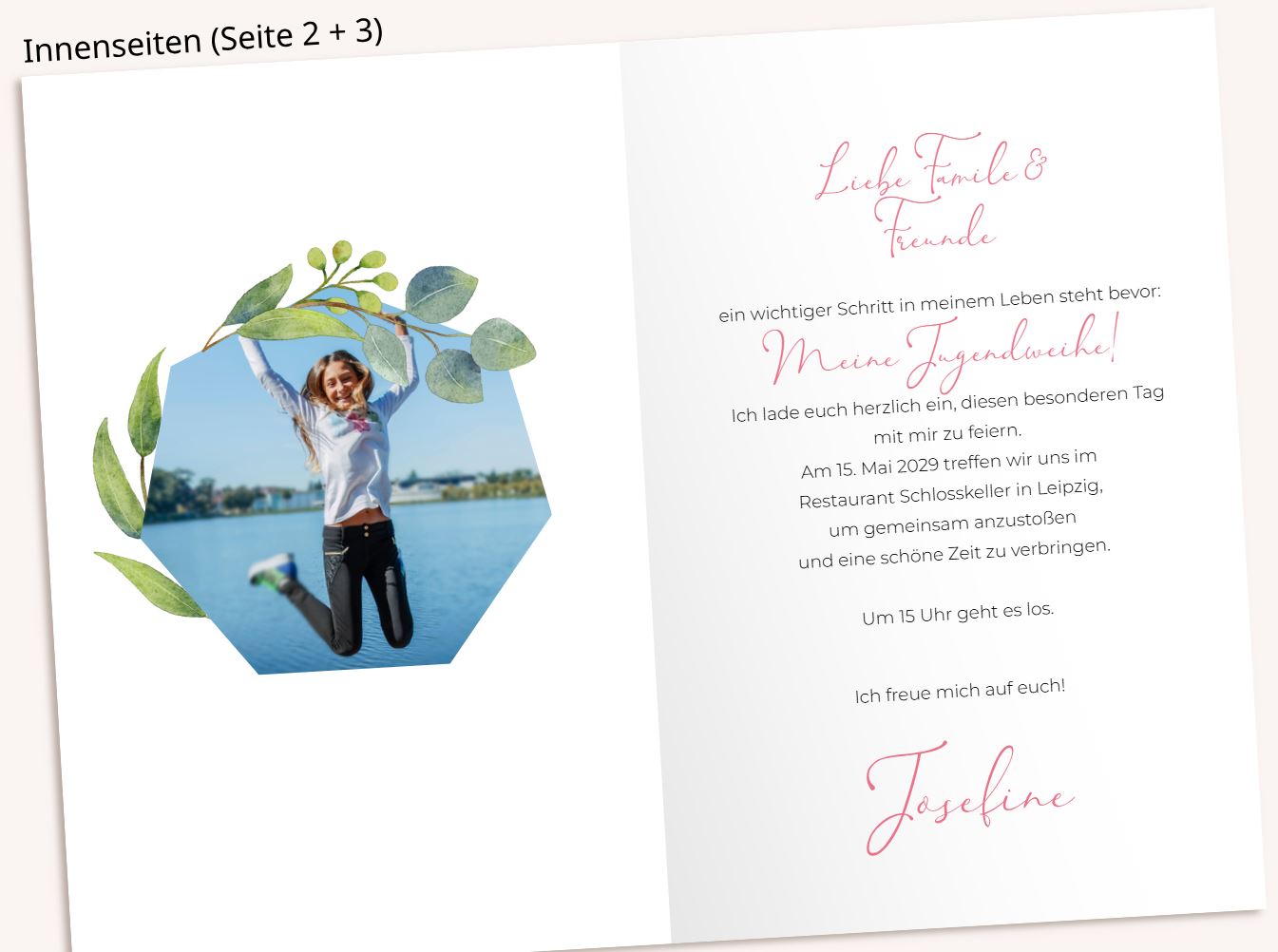 die Jugendweihe-Karten für Sie auch mit Ihrem individuellem Einladungstext und Fotos bedrucken.