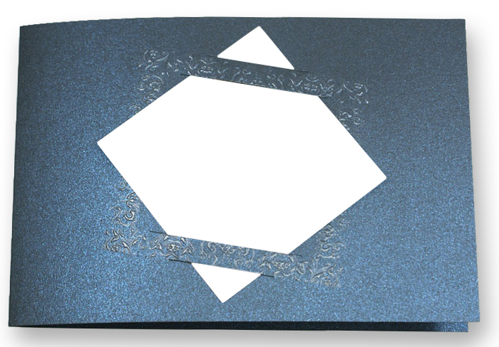 Geburtstagseinladung als elegante Klappkarte in dunkelblau-metallic mit Ornament-Bilderrahmen in Reliefprägung
