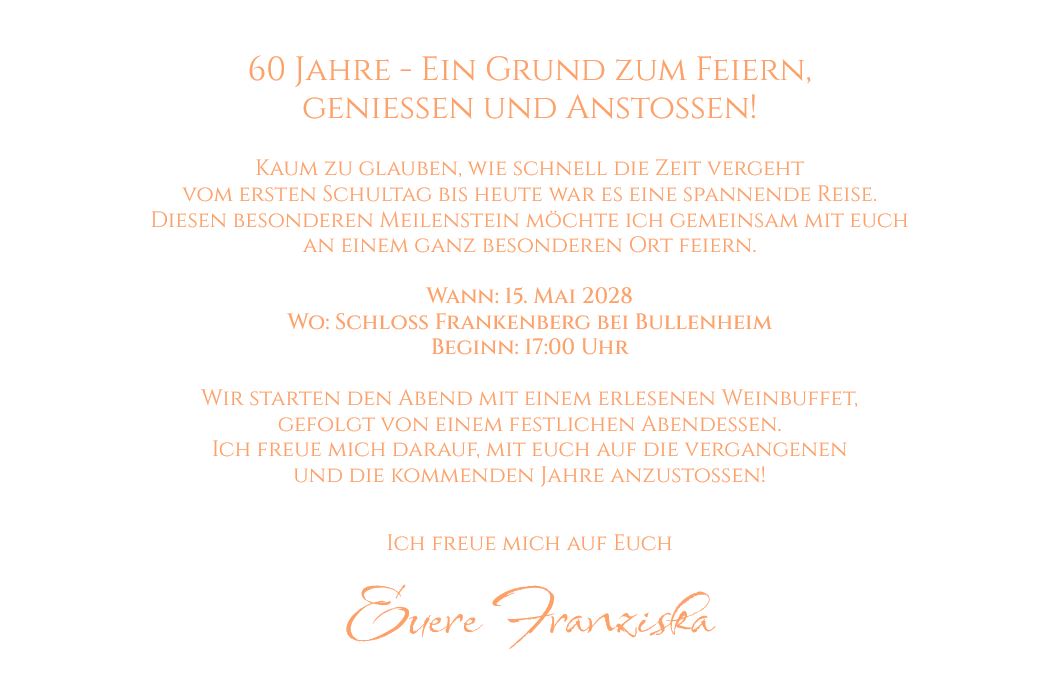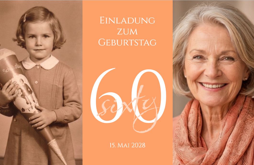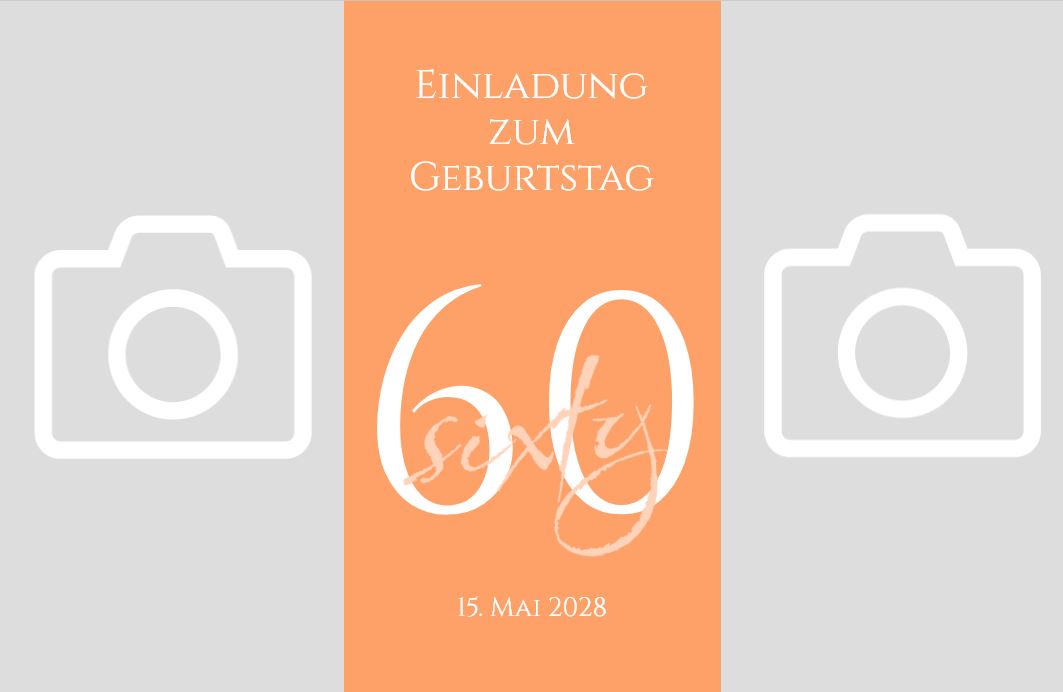 Moderne Einladungskarte in lachsfarben zum 60. Geburtstag mit eigenen Bildern und Text