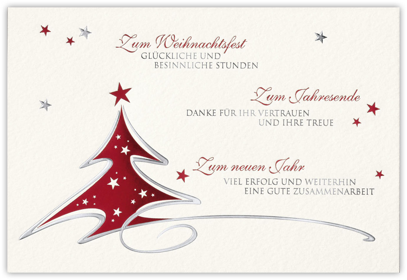 Auf der cremefarbenen Karte mit rotem Weihnachtsbaum steht: Zum Weihnachtsfest glückliche und besinnliche Stunden, Zum Jahresende Danke für Ihr Vertrauen und Ihre Treue sowie Zum neuen Jahr viel Erfolg und weiterhin eine gute Zusammenarbeit.