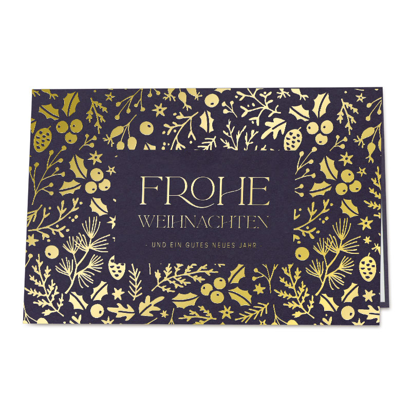 Dunkelblaue Weihnachtskarte mit edler Goldfolienprägung von "Frohe Festtage" und Zweigen, inkl. Einlegeblatt innen.