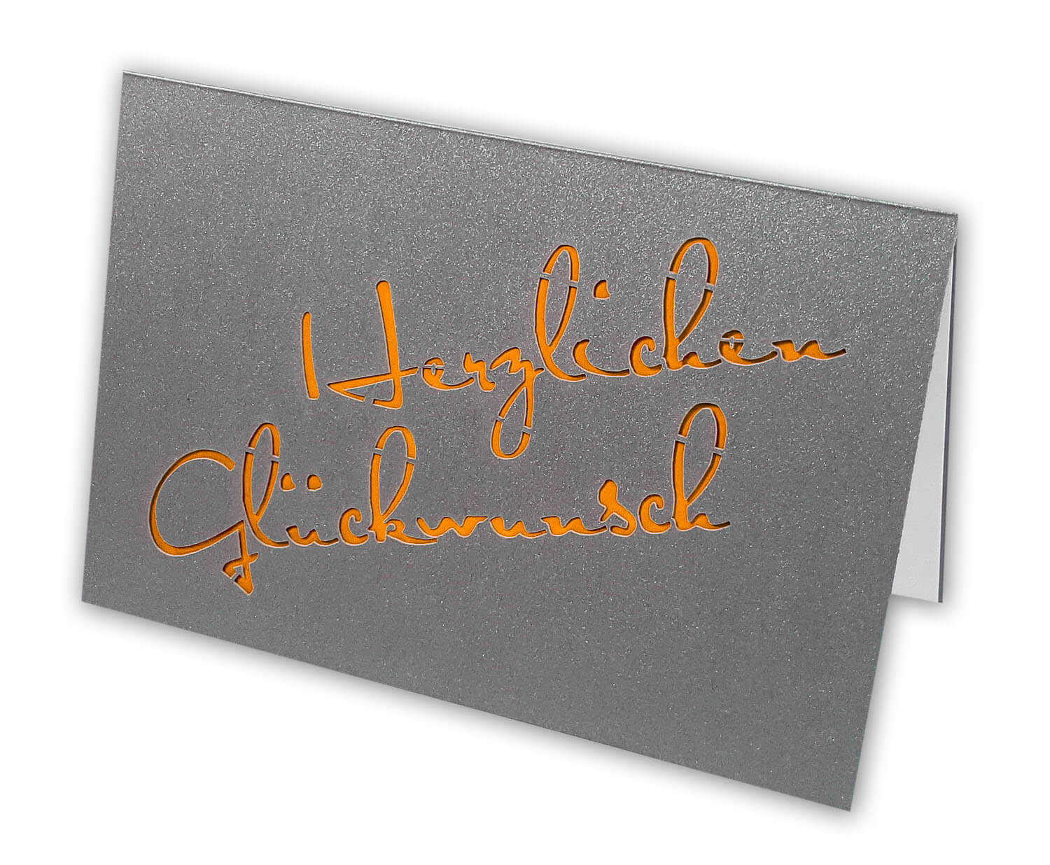 Anthrazitgraue Glückwunschkarte mit Ausstanzung "Herzlichen Glückwunsch" und orangefarbenem Einlegeblatt. Klappkarte für Glückwünsche zu jedem Anlass, aus exklusivem, anthrazitgrauem Metallickarton, mit Stanzung "Herzlichen Glückwunsch". Durch die Ausstanzung ist das weiße Falt-Einlegeblatt mit orangefarbener Vorderseite zu sehen. Auf Wunsch können wir die Vorderseite des Einlegeblattes auch in Ihrer Wunschfarbe (Firmenfarbe) bedrucken. Wenn Sie die Option "Artikel bedrucken lassen" wählen, können wir das Einlegeblatt für Sie auch mit Ihrem individuellem Glückwunsch-Grußtext und Firmenlogo sowie Unterschrift bedrucken. Klappkarte im Diplomatenformat: 16,5 x 11,5cm, Breite x Höhe (offen 16,5 x 23 cm) Der Kartenpreis ist inklusive Briefumschlag, es wird automatisch ein passendes Briefkuvert und ein Einlegeblatt mitgeliefert. Farbe (vorne / innen) Karte anthrazitgrau / anthrazitgrau, Einleger weiß / orange Format:  Klappkarte 16,5 x 11,5 cm Breite x Höhe (aufgeklappt 16,5 x 23 cm) Papier:  Karte 250g Metallickarton anthrazitgrau / Einleger 100g weiß Kuvert / Briefumschlag:  Ja, inklusive weiß Porto:  Standardbrief, mehr Infos Lieferumfang:  Klappkarte, Briefumschlag, Einleger Passend aus der gleichen Serie: