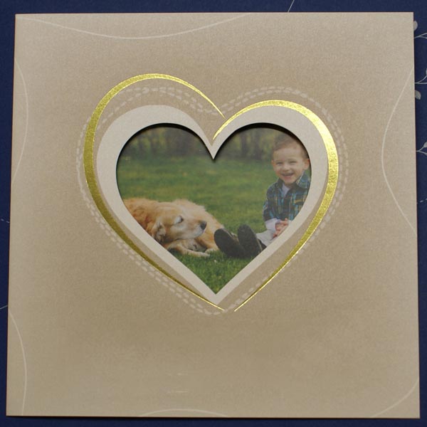 Hochzeits-Fotokarte aus hochwertigem, altweißem Metallic-Karton mit Farbdruck und Stanzung in Herzform sowie mit einer herzförmigen Goldfolienprägung. Ein Foto im Format 8x8 cm bis 14x14 cm kann eingeklebt oder auch von us aufgedruckt werden.