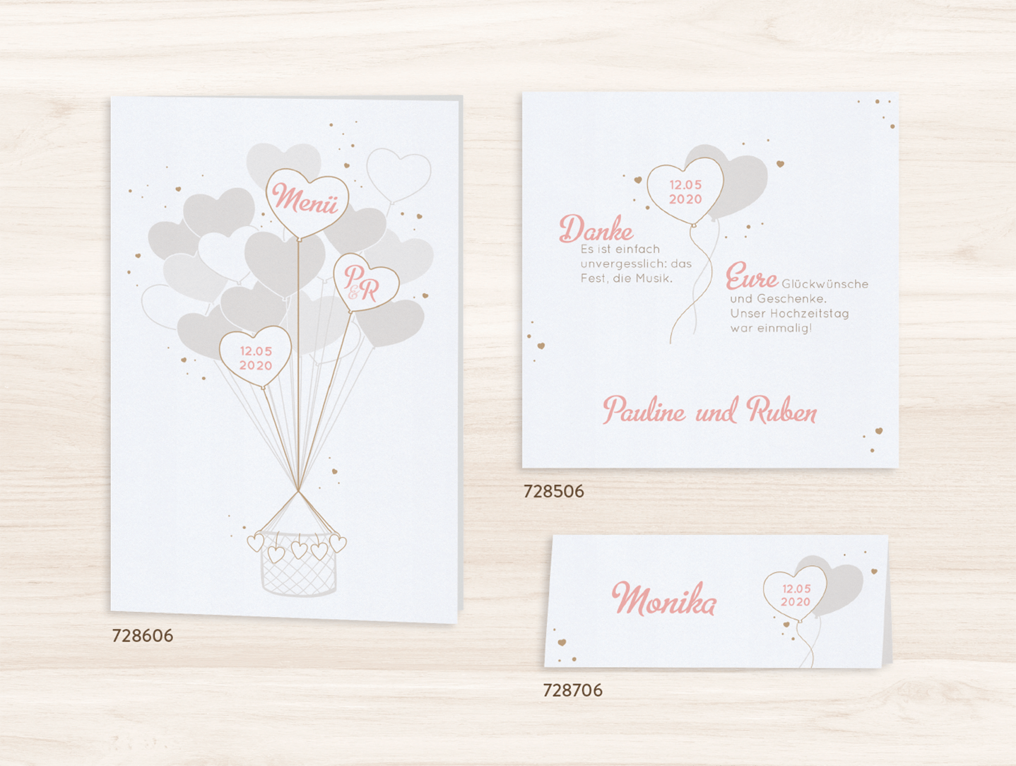 Zu dieser Einladungskarte sind zusätzlich Menükarten, Tischkarten, Save-the-Date Karten/Dankkarten aus der gleichen Serie erhältlich.