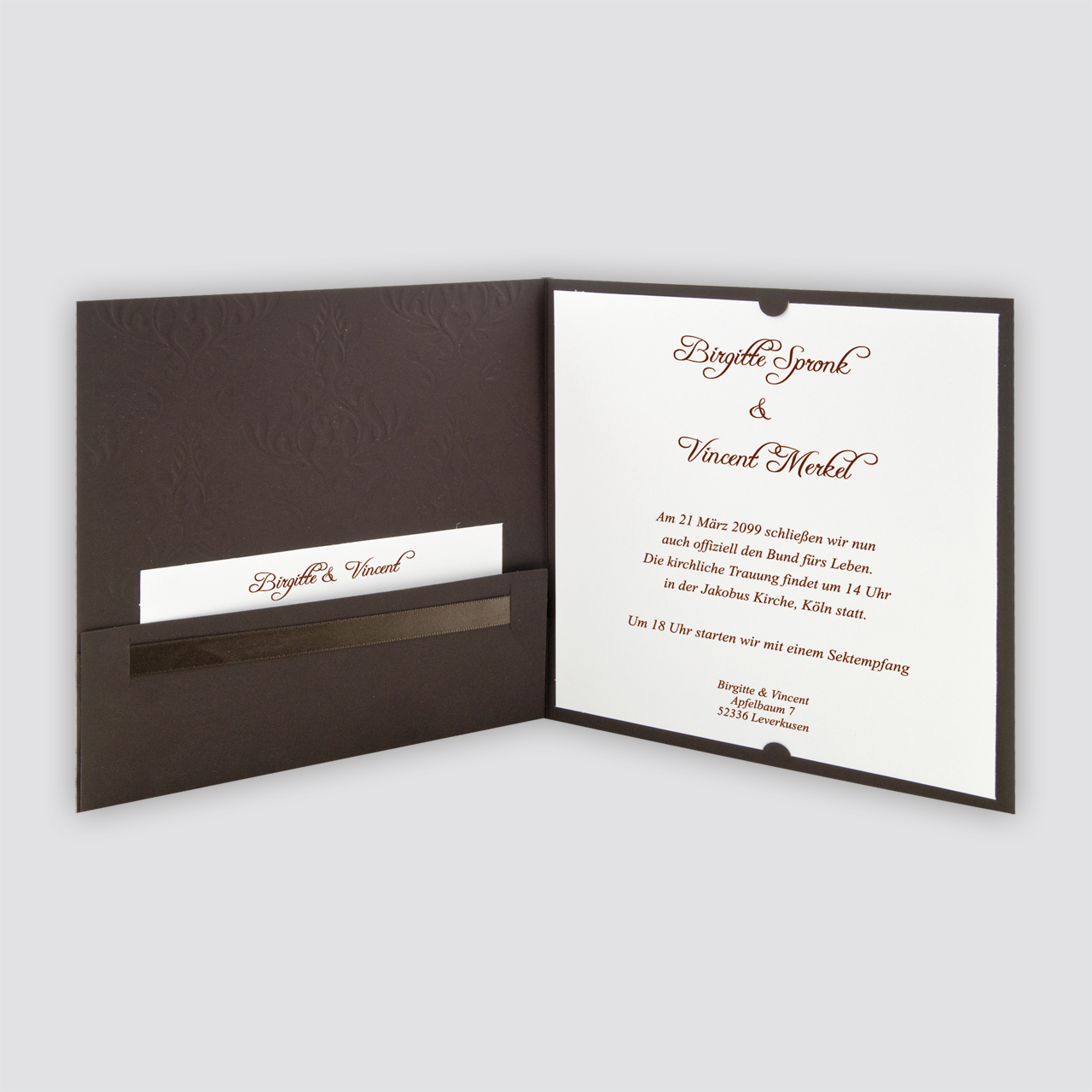 Hochzeitskarte aus hochwertigem, dunkelbraunem Design-Karton mit reliefgeprägtem Ornament mit glänzenden Herzen. Es wird ein weißer Einleger für den Haupttext, ein etwas kleinerer für einen Zusatztext sowie eine kleine Anhängekarte für die Vorderseite inkl. braunem Band mitgeliefert. Das Kärtchen der Vorderseite wird in zwei verschiedenen Versionen beigelegt, einmal normal und einmal mit mittig gestanztem Herz.