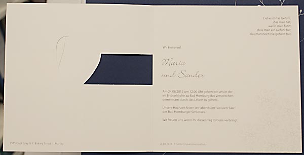 Einladungskarte / Hochzeitskarte aus hochwertigem, weißem Design-Karton mit effektvoller Stanzung und Faltung, sowie mit Farbdruck und Folienprägung.