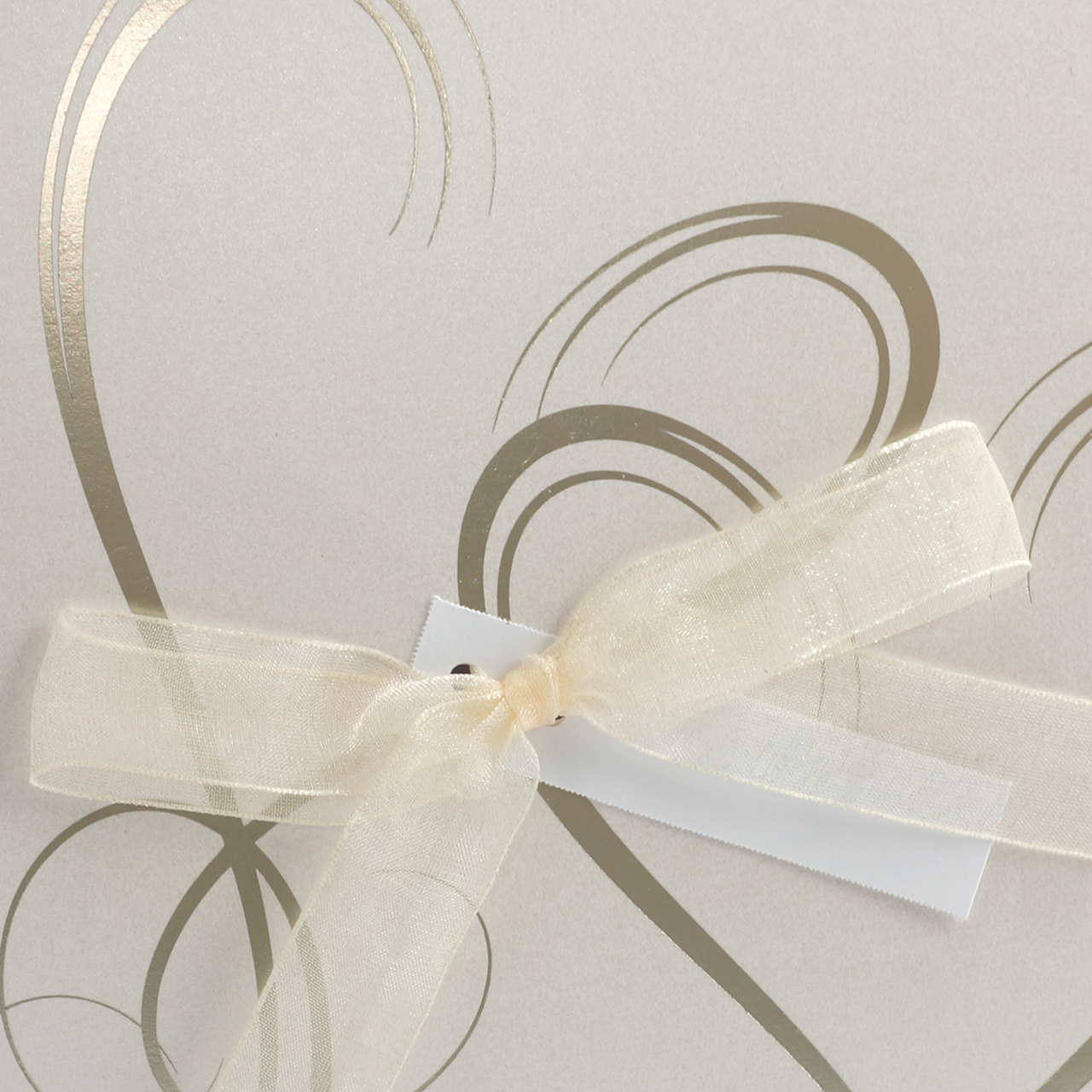 Hochzeitskarte perlmutt mit goldenen Herzen und Satinband
