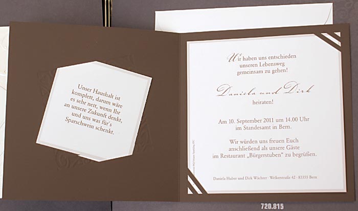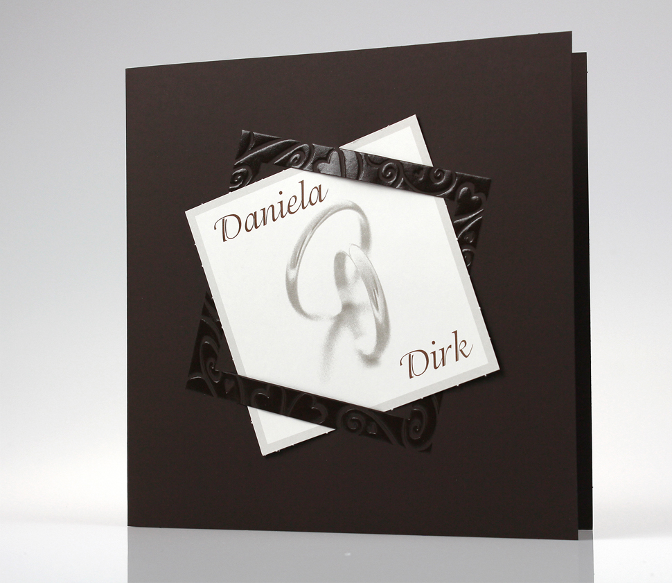 Hochzeitskarte aus hochwertigem, dunkelbraunem Design-Karton mit glänzender Folienreliefprägung. Zu der Karte wird ein weißes Metallic-Einsteckblatt für den Haupttext geliefert. Ebenfalls sind zwei kleinere Karten enthalten, die auf der Vorderseite und auf der linken Innenseite angebracht werden können. Die gezeigten Ringe sind bereits vorgedruckt.