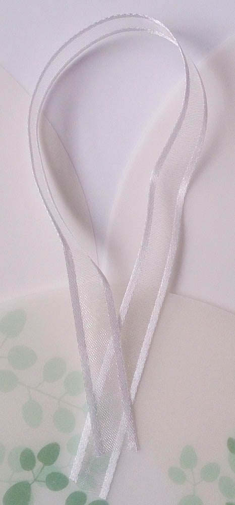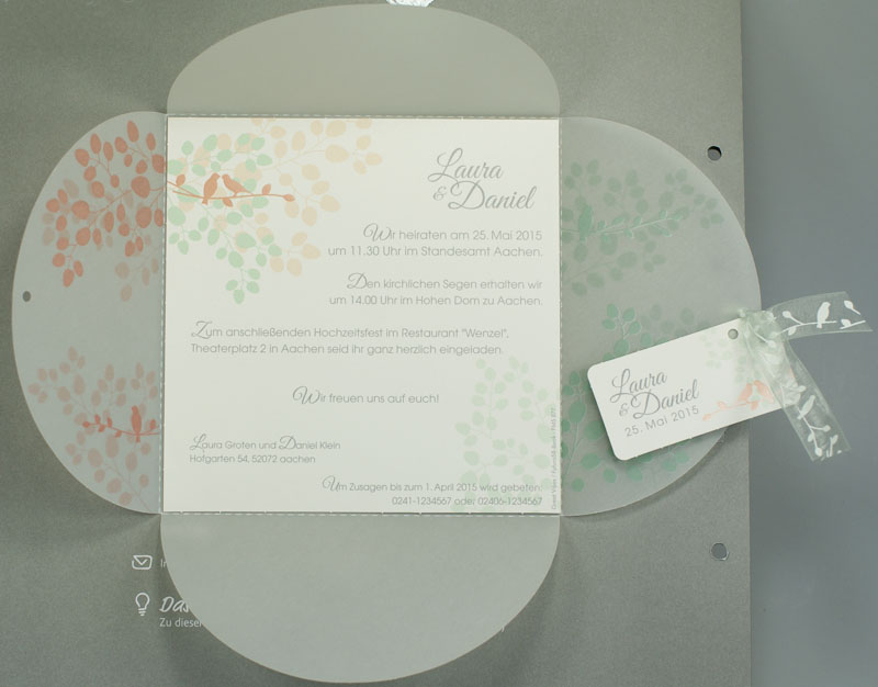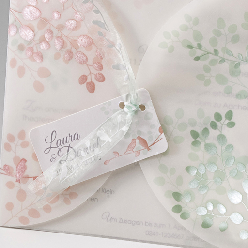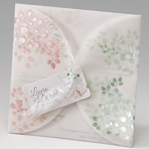 Hochzeitskarte aus hochwertigem, weißem Metallic-Karton mit Farbdruck/Prägung von Zweigen und Blättern sowie zweier Vögel. Sowohl die Einlegekarte, die Namenkarte als auch das Umschlag-Transparent sind mit den Motiven versehen. Das abgebildete Band mit weißem Vogel/Zweig-Motiv ist leider nicht mehr lieferbar. Es wird alternativ ein transparentweißes Satinbändchen mit weißem Rand mitgeliefert.