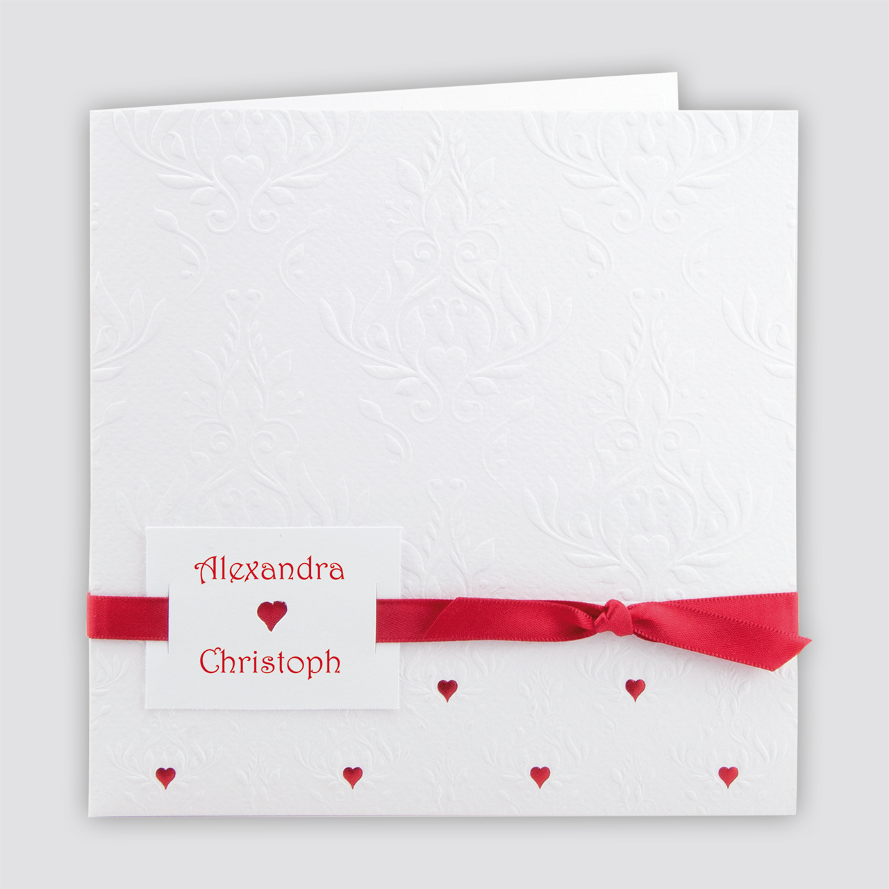 Hochzeitskarte aus hochwertigem, weißem Aquarell-Karton mit Reliefprägung der Ornamente und (roten) Herzen. Ein weißer Einleger für den Haupttext, ein etwas kleinerer für z.B. Organisatorisches (wird links in die umgeklappte Innenseite gesteckt) und eine kleine Karte für die Vorderseite liegen inkl. rotem Bändchen bei. Das kleine Kärtchen für die Vorderseite wird in zwei Versionen mitgeliefert, einmal normal und einmal mit gestanztem Herz.