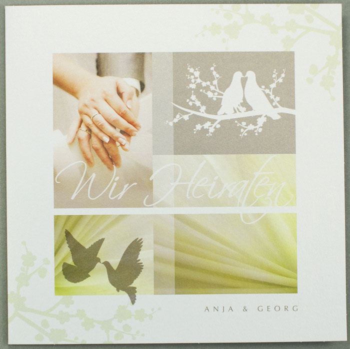 Hochzeitskarte aus hochwertigem, weißem Metallic-Karton mit Farbdruck. Auch die Innenseite der Karte ist bedruckt mit Tauben und Zweigen.