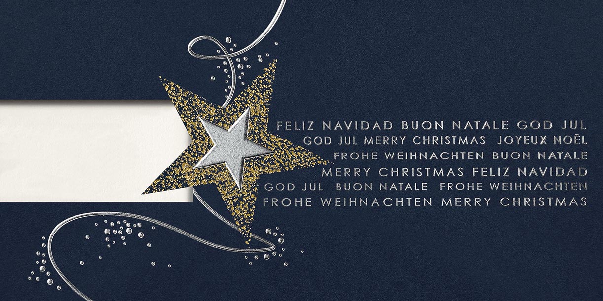 Geschäftliche Weihnachtskarte mit Fensterstanzung für Ihr Firmenlogo, internationalen Grüßen und Weihnachtsstern.