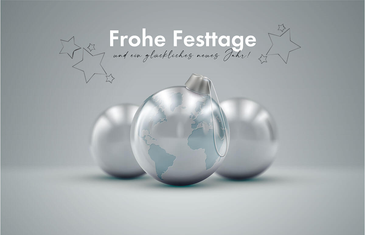Mehrsprachige Firmen-Weihnachtskarte mit Weltkugeln, Tannenbäumen und kleinen Sternen.