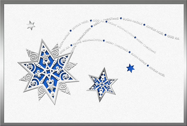 Die Weihnachtskarte aus weißem Metallic-Karton ist mit edler Silberfolienprägung und Laserstanzung veredelt. Sterne in unterschiedlichen Größen sind bei dieser Grußkarte ausgelasert. Dadurch wird der goldene Falteinleger sichtbar. "Frohe Weihnachten" ist in mehreren Sprachen in silber auf die Weihnachtskarte gedruckt.