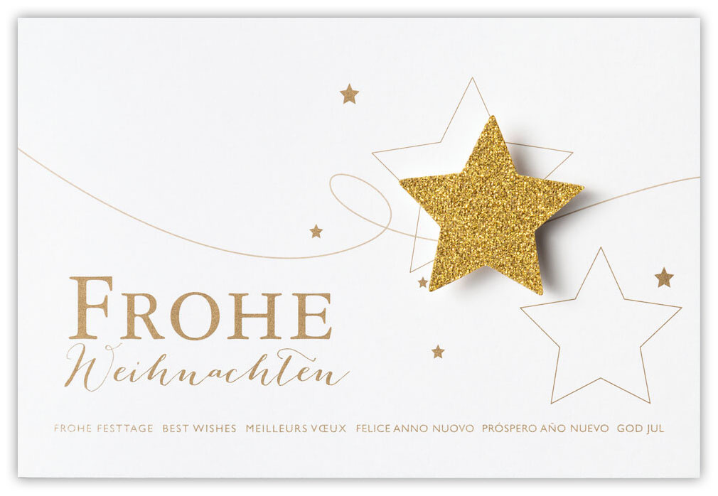 Klappkarte aus weißem Design-Karton mit Ausstanzung eines Weihnachtssternes. Durch die Stanzung wird das rote Falteinlegeblatt sichtbar. Der Stern ist umrandet im edlen Silberfoliendruck. Auch der Weihnachtsgruß "Frohe Weihnachten" ist in mehreren Sprachen in silber auf die Grußkarte geprägt. Kleine, silberne Sterne verzieren die Grußkarte zusätzlich.