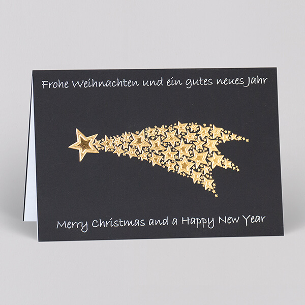 Diese luxuriöse Weihnachtskarte ist aus edlem, schwarzem Metallic-Karton mit schwarzer und goldener Folienprägung angefertigt. Zwei Sterne sind auf der Grußkarte zu sehen. Ein cremefarbener Falteinleger wird mitgeliefert.