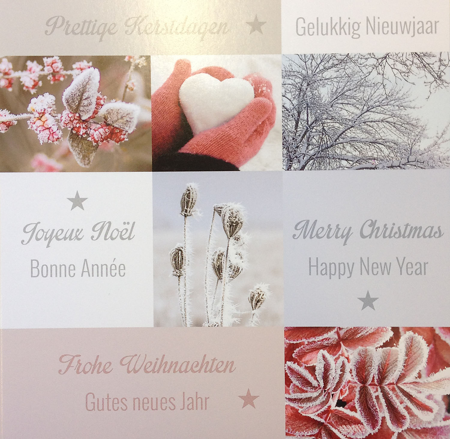Weihnachtskarte mit winterlichen und weihnachtlichen Impressionen im DIN lang Format und Glanzdruck.