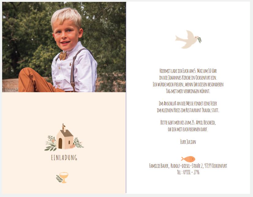 Kommunions-Einladung, liebevoll illustriert, mit chrislichen Symbolen und einer Kirche im trendigen Kraftpapier-Design.