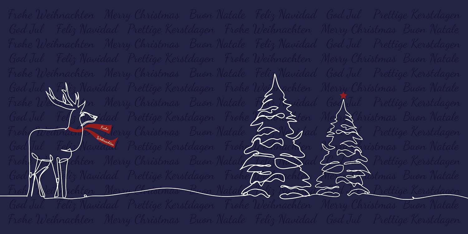Moderne Weihnachtskarte mit internationalen Grüßen und einem Hirschkopf mit prächtigem Geweih, mit Spendenanteil zugunsten der Deutschen Krebshilfe.