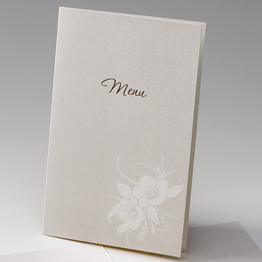Menükarte aus hochwertigem, perlmuttfarbenem Metallic-Karton mit Blüten-Ornamentdruck.