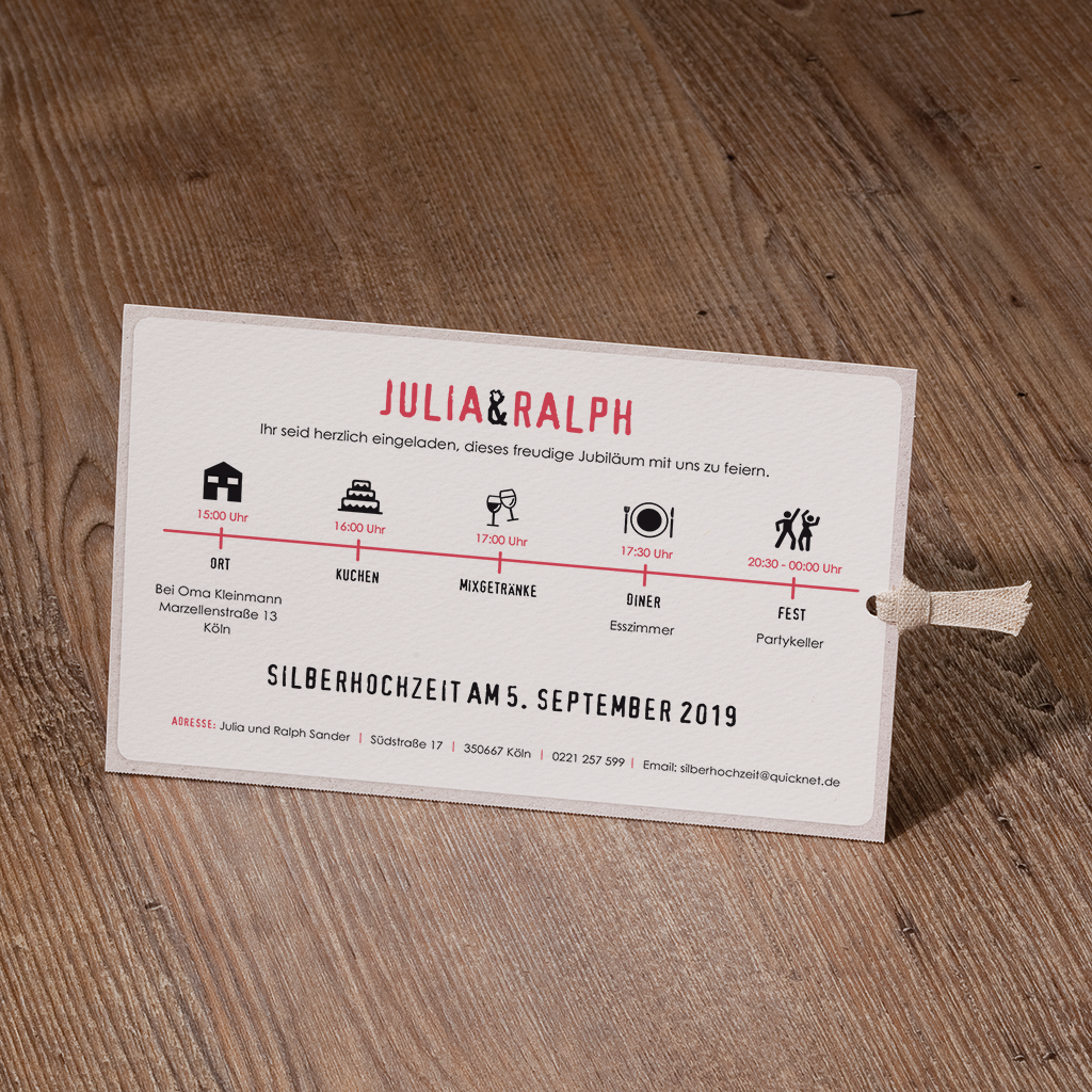 Im Beispiel wurde die moderne Pocketkarte als Einladungskarte für eine Silberne Hochzeit verwendet. Passend zum Schriftzug "Einladung" wurde hier als Beispiel auf der Vorderseite die Namen sowie das Datum des Festes in rot und schwarz aufgedruckt. Die Einsteckkarte wurde mit witzigen Icons versehen die der Karte zusätzlichen Pfiff geben. Die Icons und der Text auf Einleger und Namen und Datum auf Vorderseite sind nur Gestaltungsbeispiele und nicht auf der Karte enthalten.