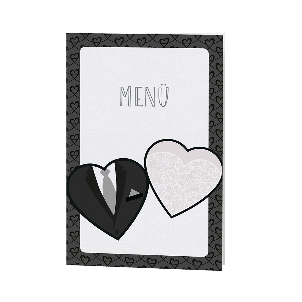 Diese moderne Hochzeitskarte als Einschubkarte wird Ihre Gäste beeindrucken. Das Außenteil der Einsteckkarte aus schwarzem Metallic-Strukturkarton mit goldschimmer Effekt stellt einen Anzug dar. Die passende Einsteckkarte aus hochwertigem weißen Metallic-Karton zeigt auf der rechten Seite das passende Brautkleid dazu. Die Umrisse des Brautkleides werden durch eine Kontur in Perlmuttfolie sichtbar.