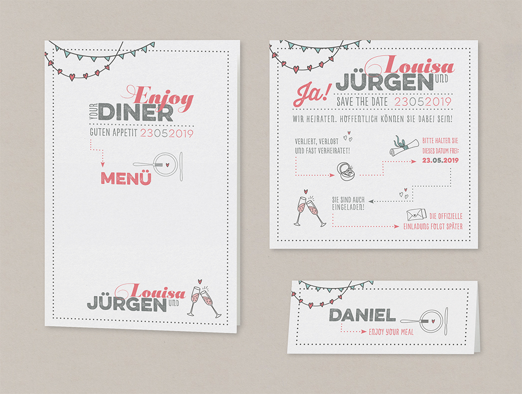 Zu dieser Menükarte sind zusätzlich Einladungskarten, Tischkarten, Save-the-Date-Karten/Danksagungskarten erhältlich.
