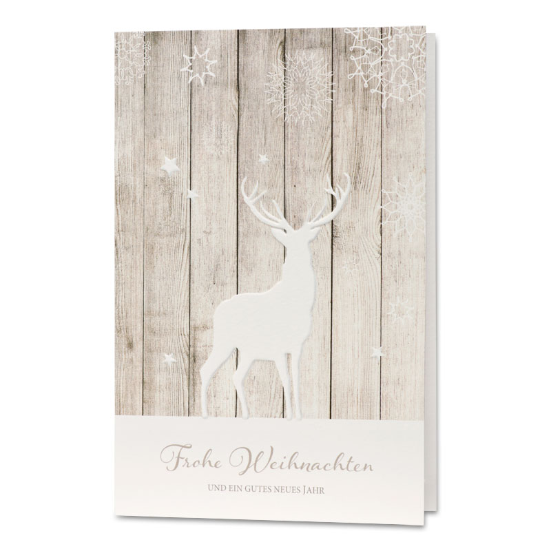 Ein modern gestalteter Hirsch ist zu sehen. Der deutsche Gruß "Frohe Weihnachten" ist in spürbarem, weißen Foliendruck auf die Klappkarte geprägt.