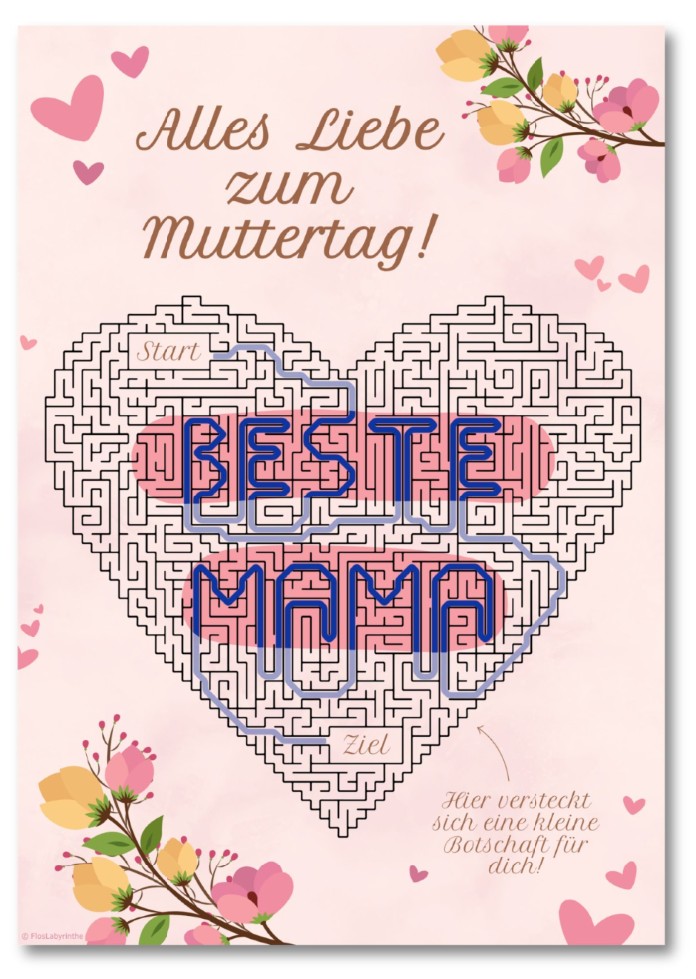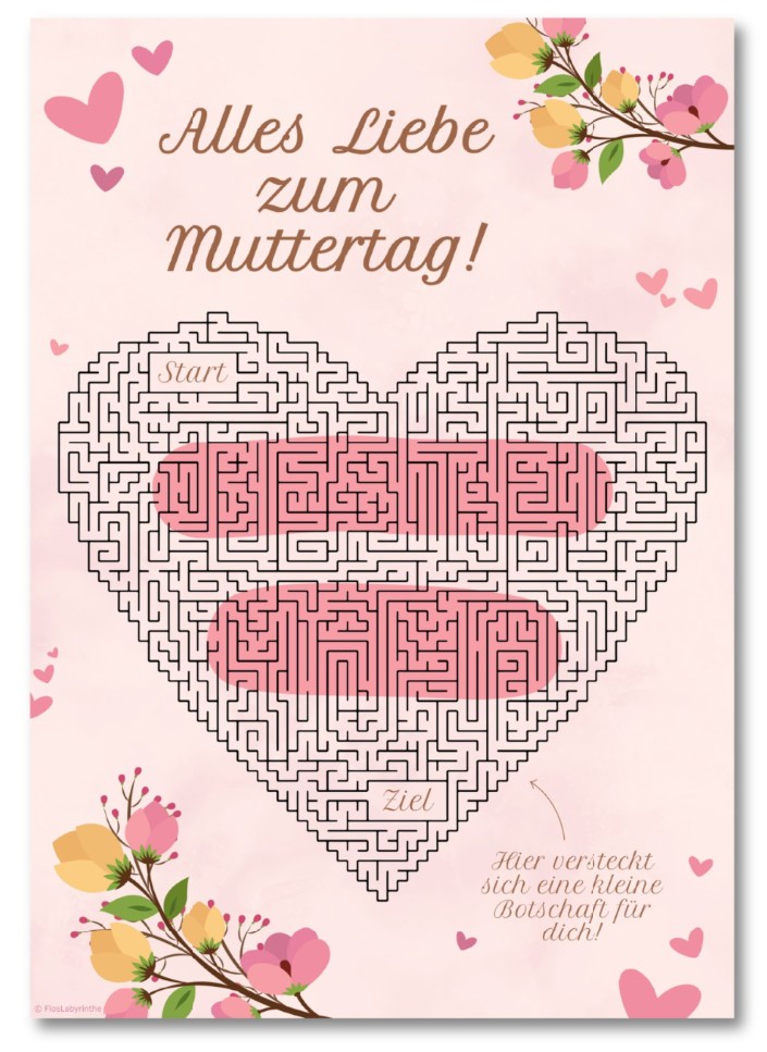 Kreative Herz-Labyrinth Rätselkarte zum Muttertag.