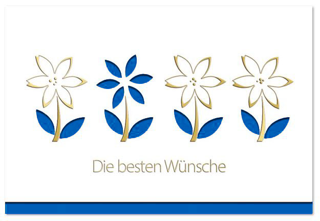 Vier Blumen sind formgestanzt und in gold foliengeprägt. Darunter steht ebenfalls in gold geprägt "Die besten Wünsche".